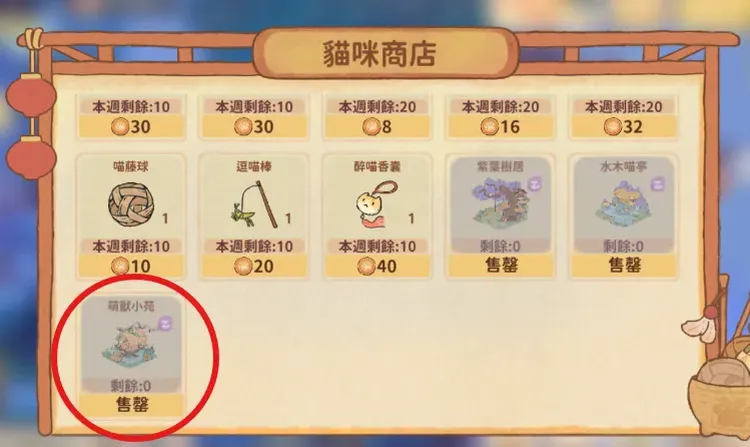 - 在貓咪商店花費600貓幣購買「萌獸小苑」
