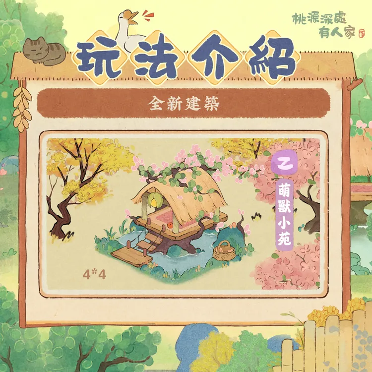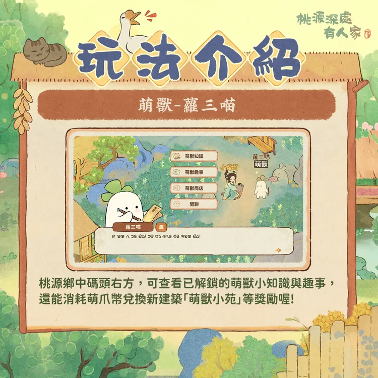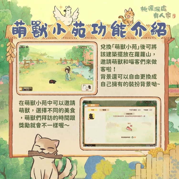 - 「萌獸小苑」邀請貓咪與萌獸拜訪,花費不同的食物,寵物們拜訪的時間與獎勵不同(主要都是貓幣)