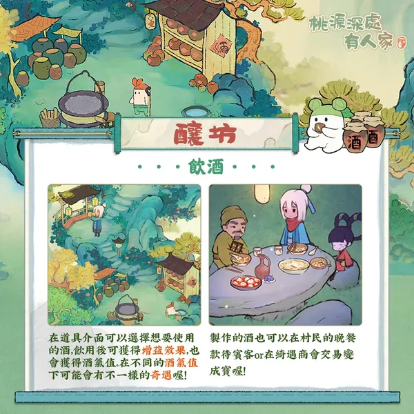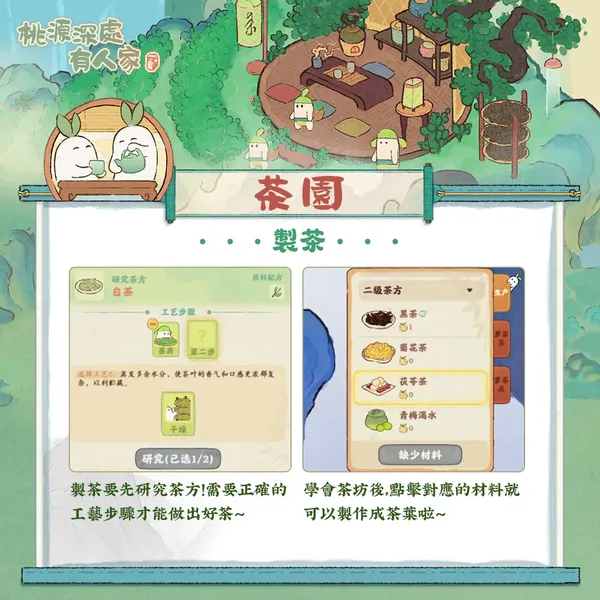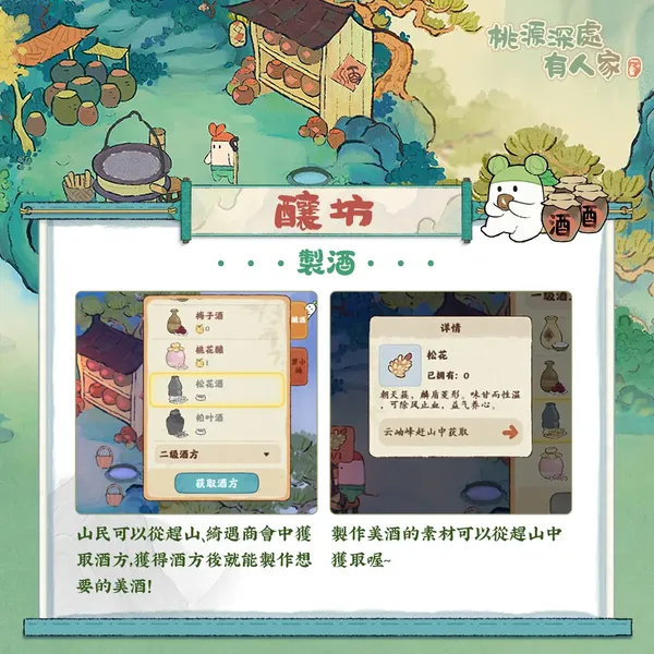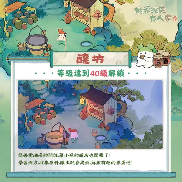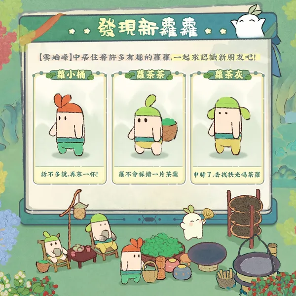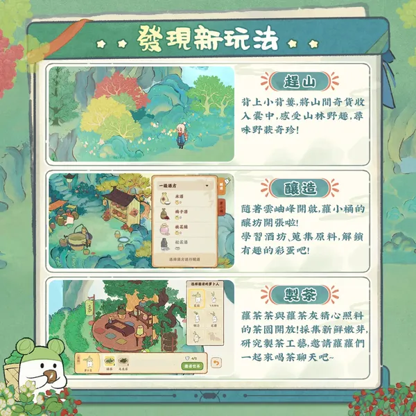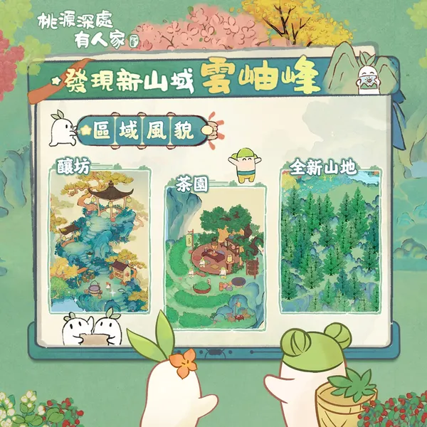 首頁 攻略集中版 蘿山大小事 雲岫峰攻略總篇 雲岫峰攻略總篇 全新製茶、釀酒玩法大公開 Facebook 分享 LINE 分享 雲岫峰釀酒篇 學習釀造美酒的完整流程,解鎖全新身份「謫仙醉酒」。 雲岫峰茶園篇 掌握製茶的精髓與工藝,開啟「賭書潑茶」的雅緻生活。 雲岫峰趕山篇 詳盡的山貨圖鑑、快速搜尋功能,幫助你快速判斷山貨功能。 雲岫峰彩蛋與成就篇 喝茶與釀酒的成就與趣事。 全新地圖「雲岫峰」09/17 開放! 新區域位於 「仙女湖」 下方 等級達𝟰𝟬級、舒適度 𝟵,𝟵𝟯𝟱的山民 即可移開巨石,隨著嵐山道前往蘿! 釀坊 - 製酒 ᔐ 40級開放 #蘿小桶 的釀坊 ᔐ #製酒:獲取酒方後釀造美酒吧 ᔐ #飲酒:扶光飲用獲得特殊增益效果,不同酒氣值下將會有不同的奇遇事件!也可以在晚餐時刻與村民們一同分享喔~ 茶園 - 製茶 ꧖ 42級開放茶園 #蘿茶茶 #蘿茶灰 等你好久啦~~ ꧖ #製茶:完成正確的工藝步驟製做出好茶茶葉 ꧖ #飲茶:製做出茶葉後,邀請蘿們來飲茶聊天!與蘿們一起品茶後,還有機會收到蘿們的感謝禮物喔! 全新身分 透過以上兩種玩法,可解鎖全新身分,解鎖後可獲得 #扶光幻型、手持、稱號等等好禮窩~ ᔐ 釀酒玩法 - #謫仙醉酒 ꧖ 製茶玩法 - #賭書潑茶 更多改版圖片資訊