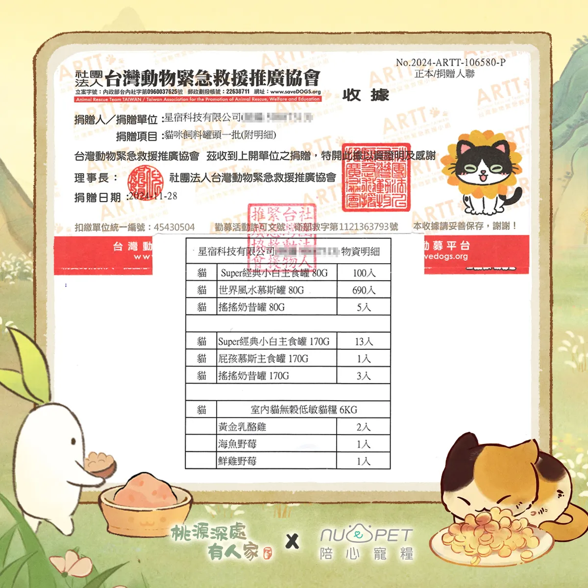 首頁 蘿事錦集 2024貓咪公益活動回顧 2024年:《桃源》x《陪心寵糧》浪浪飽食計畫回顧 Facebook 分享 LINE 分享 蘿蘿山公益捐贈!感謝山民們的集氣一起讓愛延續~ 《桃源深處有人家》X《陪心寵糧》共同捐贈! 希望通過山民的力量 讓更多小浪浪們吃得飽,吃得好! 為小浪浪們創造專屬溫馨的桃源~ 在 11/6 發起了集氣物資捐贈活動 在山民們的共同努力下 本次活動結束時超額完成原定目標! 因此《桃源深處有人家》X《陪心寵糧》攜手捐贈價值 10 萬的貓糧! 領養代替購買~讓愛不再流浪~