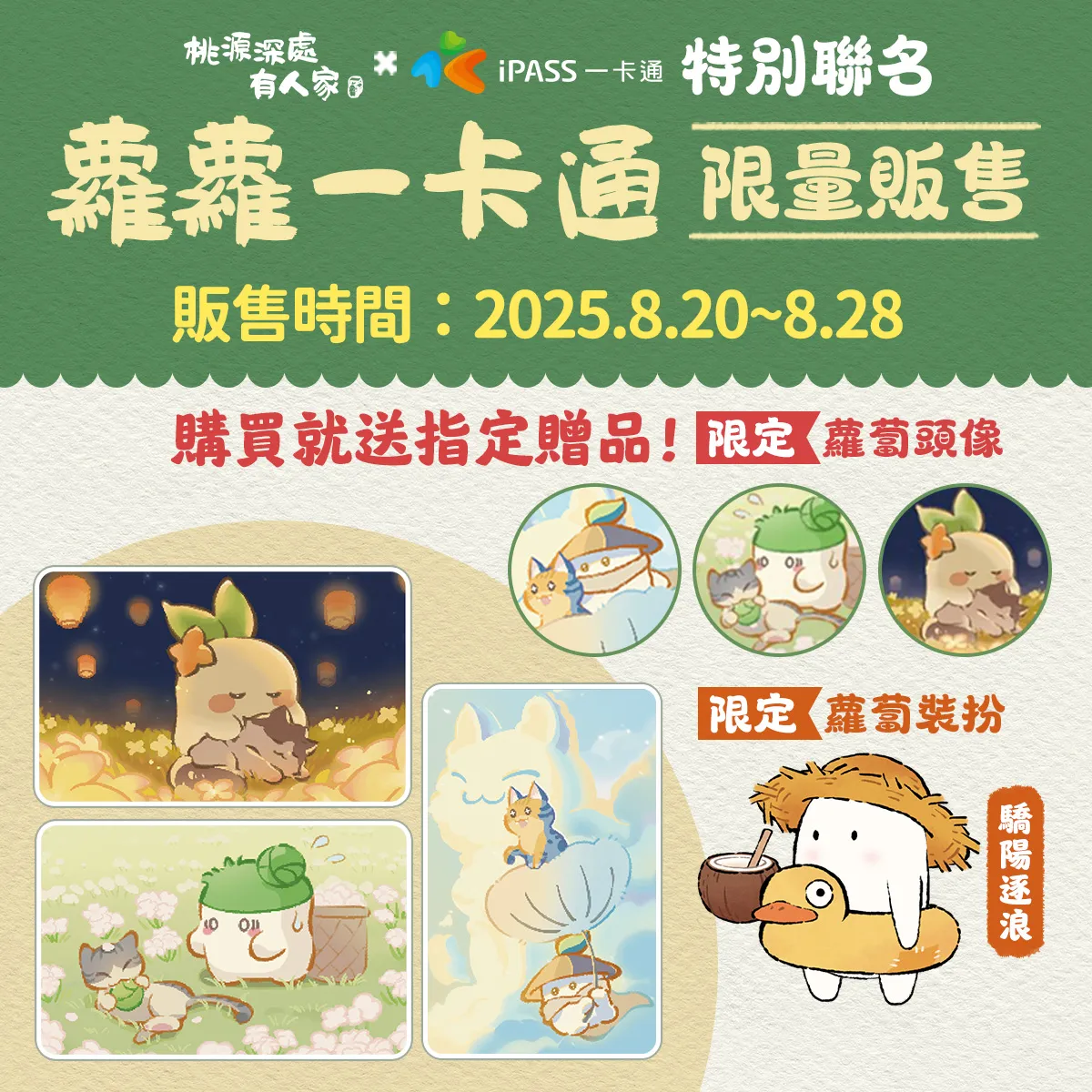 首頁 蘿事錦集 蘿蔔一卡通資訊 蘿蔔一卡通資訊:三款限定造型,限時預購! Facebook 分享 LINE 分享 𝟬𝟴/𝟮𝟬~𝟬𝟴/𝟮𝟴 限時8天不能錯過 均一價$150,購買即贈 蘿蘿超夏日【頭像+蘿蔔外觀】!蘿蘿與你一起療癒每一天! 預購方式 7-11 櫃台 將下方帶有條碼的圖片出示給店員,記得將手機螢幕調至最亮,讓店員刷條碼進行結帳。 三款超好看卡面 喵與蘿千里的晴空漫遊:清爽藍天療癒滿分 喵與蘿小花的暖燈願語:一起許下溫暖心願 喵與蘿咩咩的花閒午後:夏日萌趣好心情