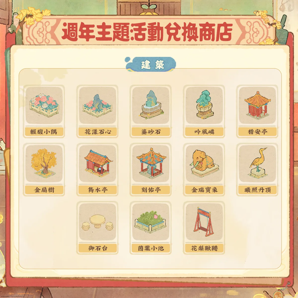 - 宮飾山舍:使用家居卷軸點亮,即可解鎖「金枝繡戶」26件甲級傢俱套組。